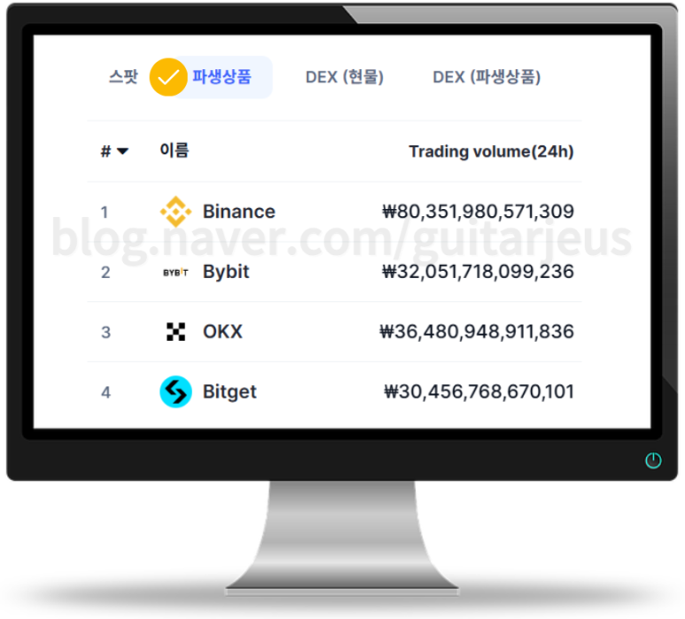 1위는 바이낸스로 파생상품 거래량 압도적 1위를 차지하고 있어요.