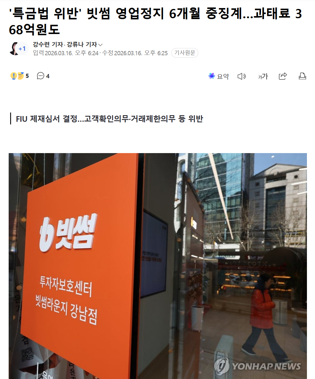금융당국이 가상자산 거래소 빗썸에 자금세탁방지 의무 위반 등으로 영업 일부정지 6개월 등 중징계와 함께 과태료 368억원을 부과했다.