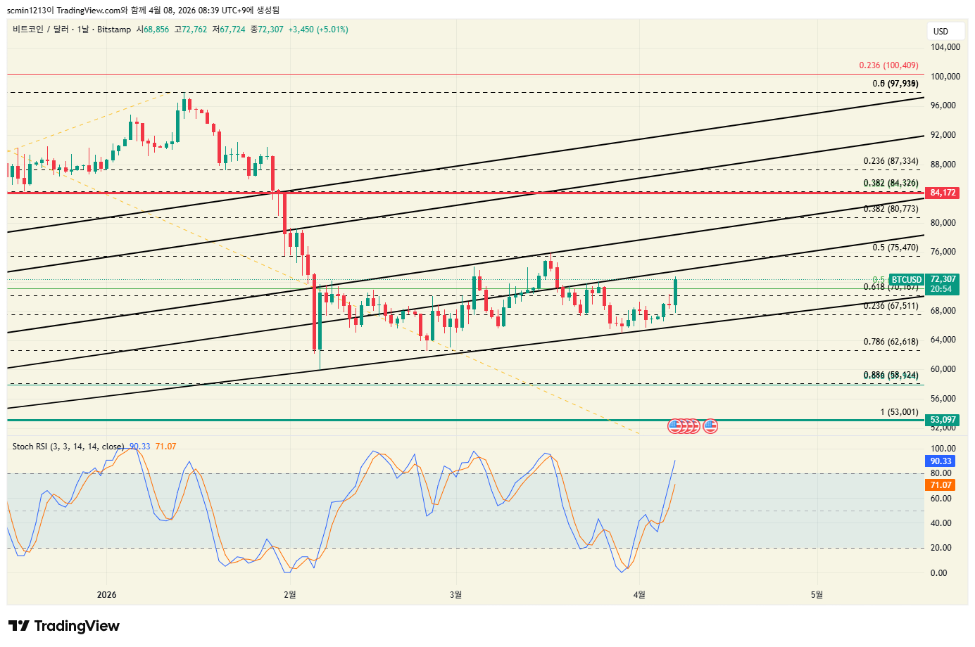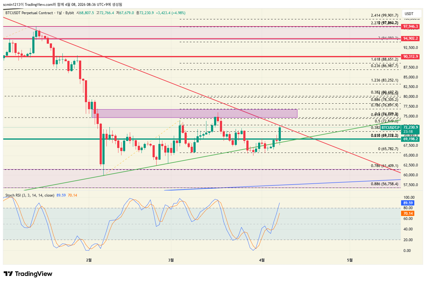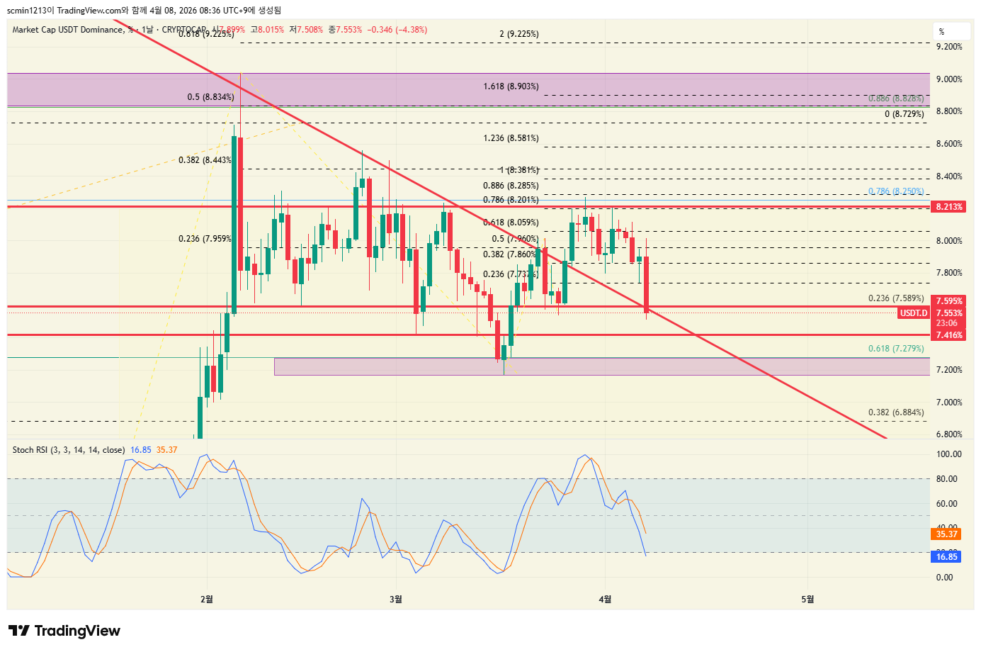 비트 하락부터 내려온 빨간추세 터치와 테돔도 함게 그려진 추세선 터치 크로스 되면서 밀고당기기중.