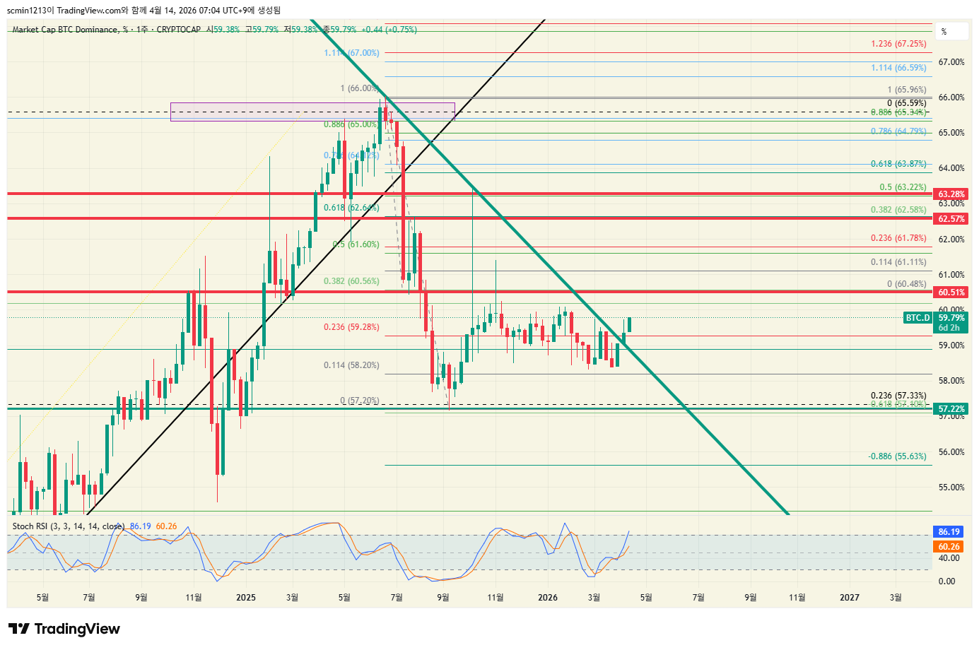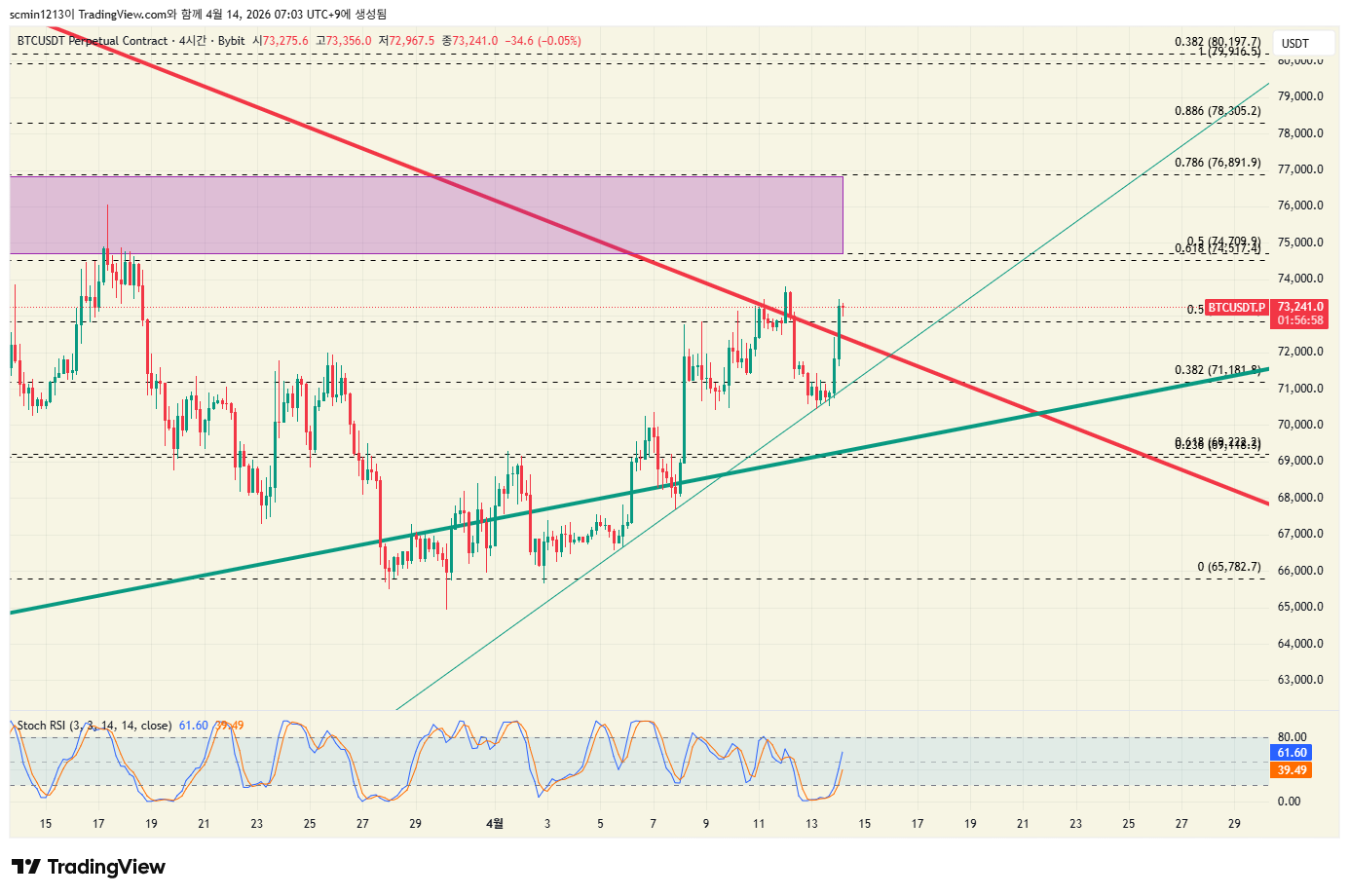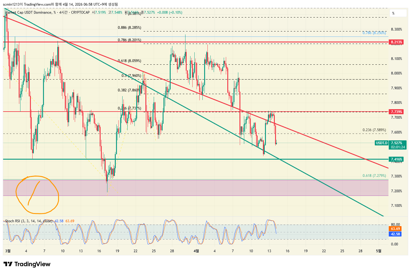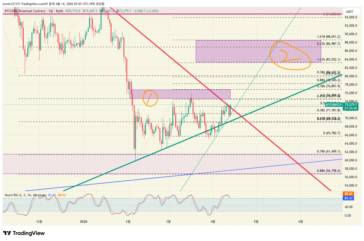 아래는 테돔차트, 초록빗각 막혀서 올렷지만 주요 저항선이 생기면서(이건 4월 12일 21시 4시간봉 막히는거 보면서 그려놓음) 다시 빨간선 안으로 들어옴