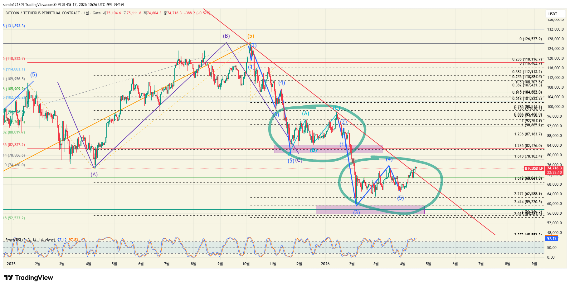 하지만 크게보면 비율상 abc 5-3-5가 나온거 같다. 카운팅을 하자면 65가 절단된 5파 끝이다