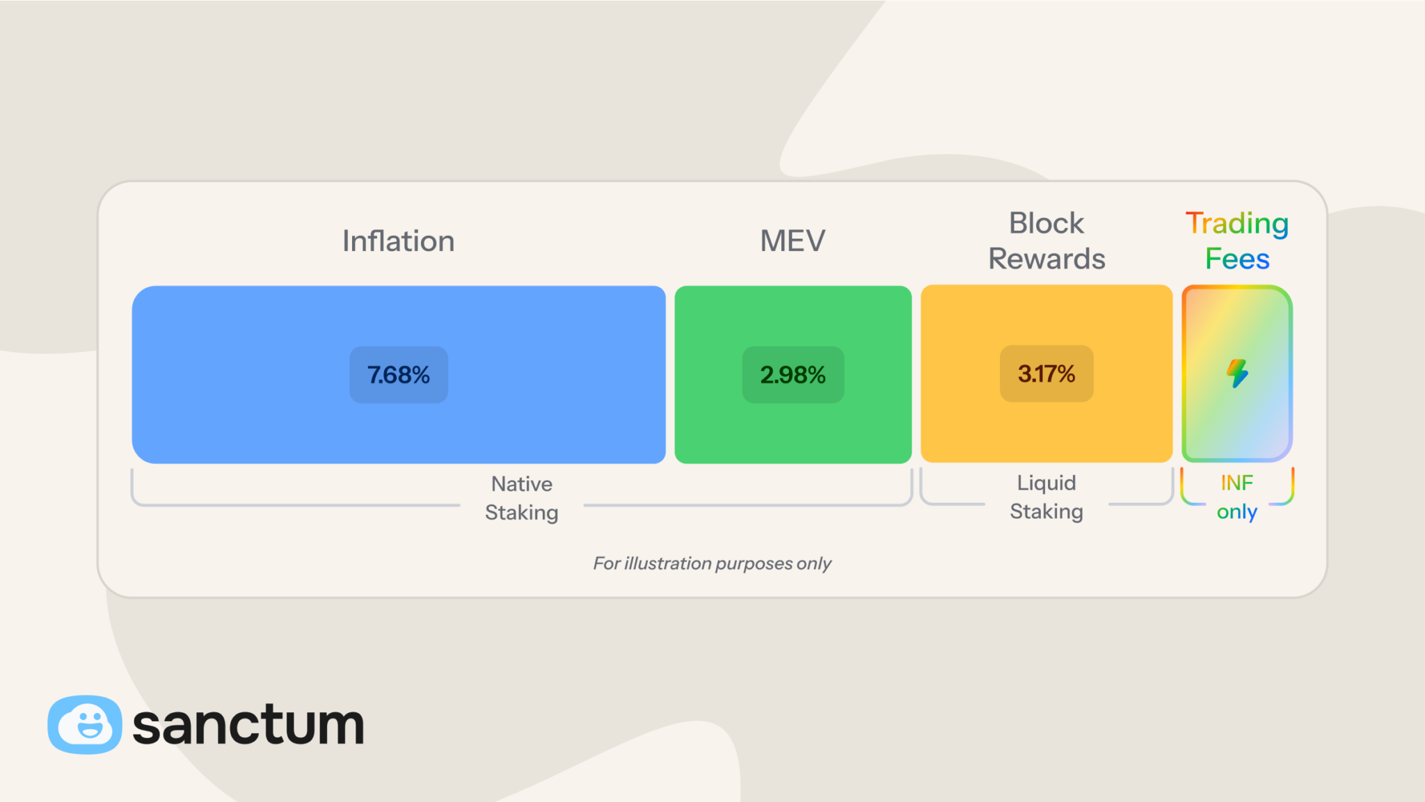 첫 번째 전략은 생텀 인피니티(Infinity, INF)를 보유하는 방식이다. INF는 SOL 예치 수익에 더해 MEV, 블록 보상, 거래 수수료까지 통합한 유일한 유동성 스테이킹 토큰(LST)으로, 별도의 운영 부담 없이 안정적인 수익을 제공한다. 최근 6개월 평균 APY는 10.5%에 달하며, 총 예치 자산은 3억 달러 이상, 홀더 수는 4만4천 명 이상이다. 또한 2025년 2분기에는 JitoSOL, mSOL 대비 15~20% 높은 APY를 기록했다.