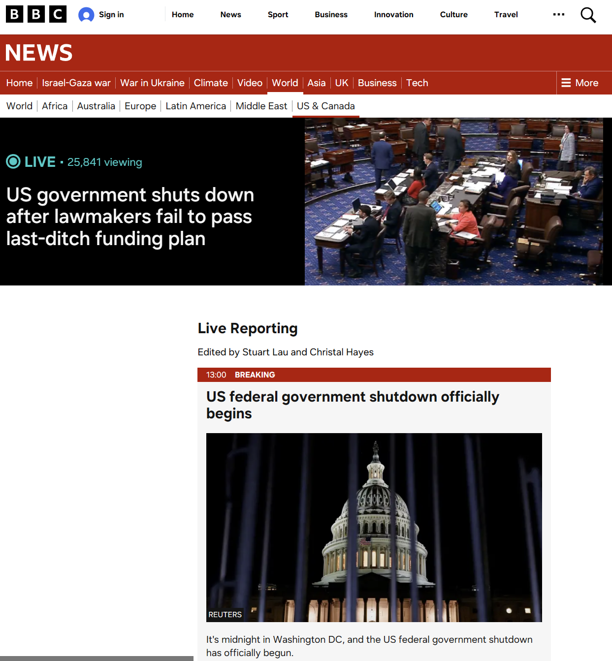 미국 의회의 예산안 처리 실패에 따라 연방 정부가 현 시간(한국시간 10월 1일 13시 1분)부로 셧다운(일시적 업무 정지)에 돌입하게 됐다고 BBC가 전했다. 이에 따라 고용 및 국내총생산(GDP) 등 주요 경제 지표 발표가 중단되며, 수십만명의 연방 직원은 자택 대기 조치에 처해진다. 미국 연방 정부 셧다운은 2018년 12월 22일 이후 약 7년 만이다.