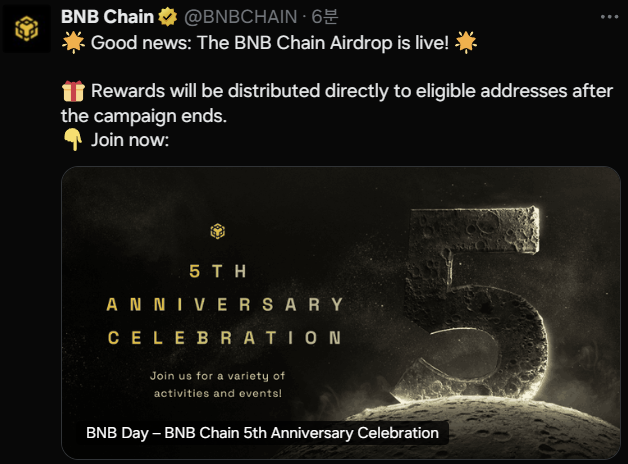 BNB체인 공식 X 계정이 해킹된 것으로 추정된다. 현재 BNB체인 X 스레드 최상단에는 5번째 에어드롭을 추진한다며 특정 주소로 연결되는 링크가 첨부된 글이 올라 있지만, 공식 홈페이지에선 해당 내용을 찾을 수 없는 것으로 확인됐다.