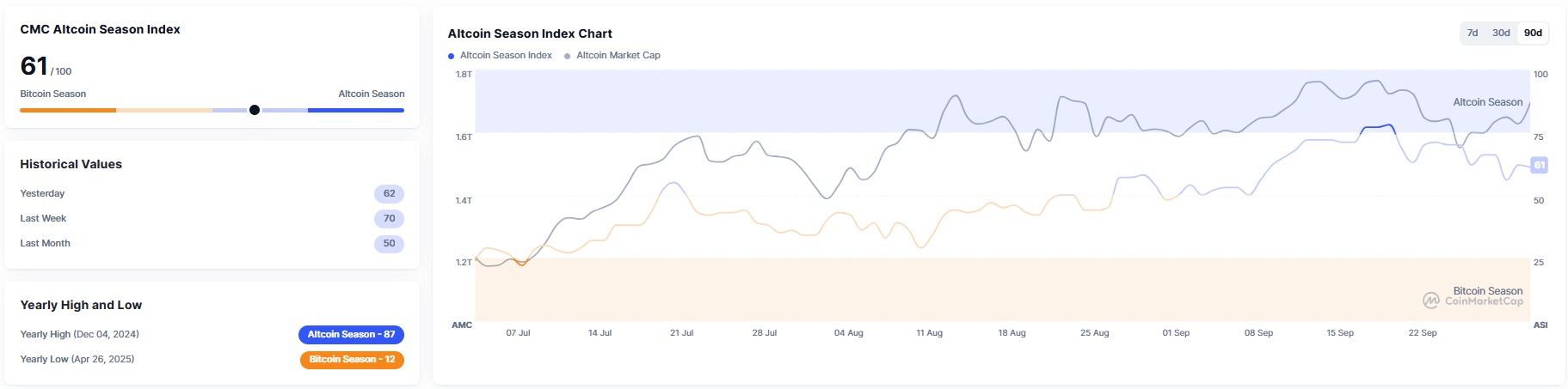 가상자산 종합 정보플랫폼 코인마켓캡의 ‘알트코인 시즌 지수’가 전날보다 4포인트 오른 61을 기록했다. 알트코인 시즌 지수는 시가총액 상위 100개 코인(스테이블·랩트 코인 제외)과 비트코인 간 가격 등락률을 비교해 책정된다. 상위 100개 코인 중 75%의 상승률이 지난 90일 동안 비트코인 상승률보다 높으면 알트코인 시즌, 반대의 경우 비트코인 시즌으로 판단한다. 100에 가까울수록 알트코인 시즌으로 본다.