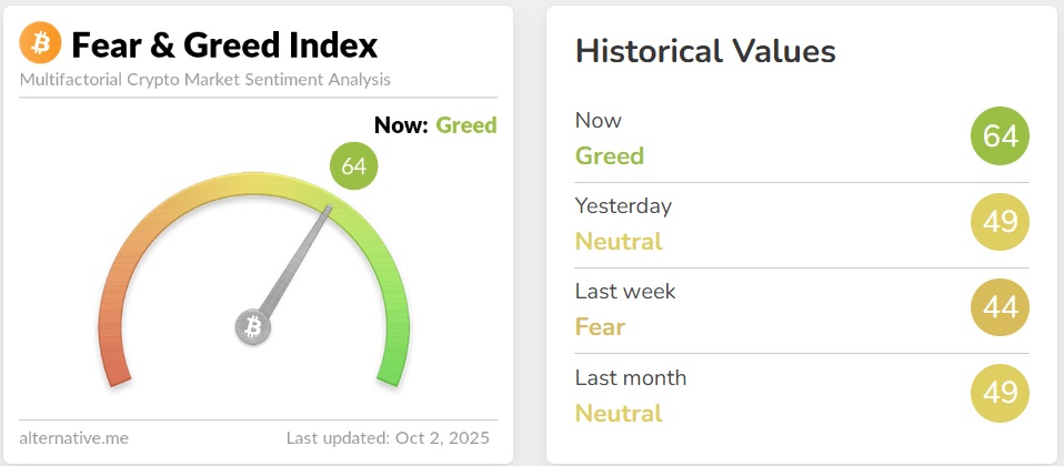 암호화폐 데이터 제공 업체 알터너티브(Alternative)의 자체 추산 ‘공포·탐욕 지수’가 전날보다 15 포인트 오른 64을 기록했다. 투심이 개선되며 중립 단계에서 탐욕 단계로 전환됐다. 해당 지수는 0에 가까울수록 시장의 극단적 공포를 나타내며, 100에 가까울수록 극단적 낙관을 의미한다. 공포 탐욕 지수는 변동성(25%), 거래량(25%), SNS 언급량(15%), 설문조사(15%), 비트코인 시총 비중(10%), 구글 검색량(10%) 등을 기준으로 산출된다.