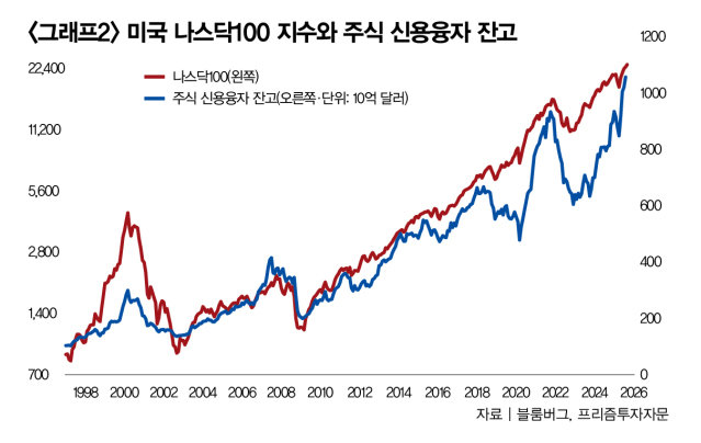 따라서 이보다 더 중요한 위험 요인은 레버리지 투자 증가다. 레버리지 투자는 돈을 빌려 주식을 매수하는 것을 뜻한다. ‘그래프2’는 주식 신용융자 잔고(Margin Debt)와 미국 나스닥100 지수의 관계를 보여주는데, 강력한 레버리지 투자 붐을 확인할 수 있다. 통상 보유 주식가치의 2.5배를 대출로 빌리기에 1만 달러(약 1400만 원)인 아마존 주식을 가진 투자자는 총액 3만5000달러(약 4900만 원)까지 투자할 길이 열린다.
