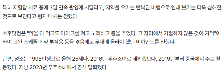 “요약: 저혈압 치료 중 → 부작용으로 붓기 → 루머 확산 → 해명 완료”