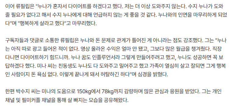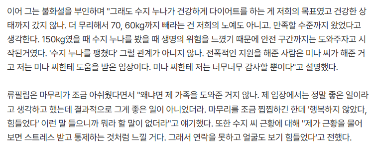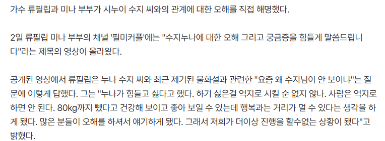 “류필립과 미나 부부가 시누이 수지 씨와의 불화설을 직접 해명했습니다. ‘돈 문제도 아니고, 도움을 준 게 전부였다’며 가족 간의 오해를 바로잡았는데요. 가족 일까지 공개적으로 해명해야 하는 현실이 조금 씁쓸하네요.”