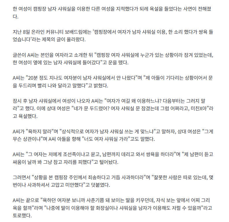 "어쩌라고 미친"…캠핑장 남자 샤워실 차지한 ...
