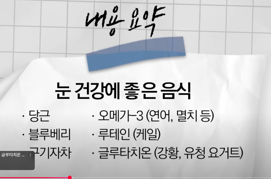 블루베리, 구기자차, 오메가3 (생선 중 알래스카산 연어, 멸치- 일주일 2인분으로 제한), 루테인(케일- 12장), 글루타치온(강황, 유청요거트로 합성 도와..)