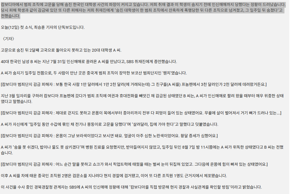 캄보디아에서 범죄 조직에 고문을 당해 숨진 한국인 대학생 사건의 파장이 커지고 있습니다. 저희 취재 결과 이 학생이 숨지기 전에 인신매매까지 당했다는 정황이 드러났습니다. 당시 피해 학생과 같이 감금돼 있던 또 다른 피해자는 저희 취재진에게 "숨진 대학생이 한 범죄 조직에서 잔혹하게 폭행당한 뒤 다른 조직으로 넘겨졌고, 그 일주일 뒤 숨졌다"고 전했습니다.
