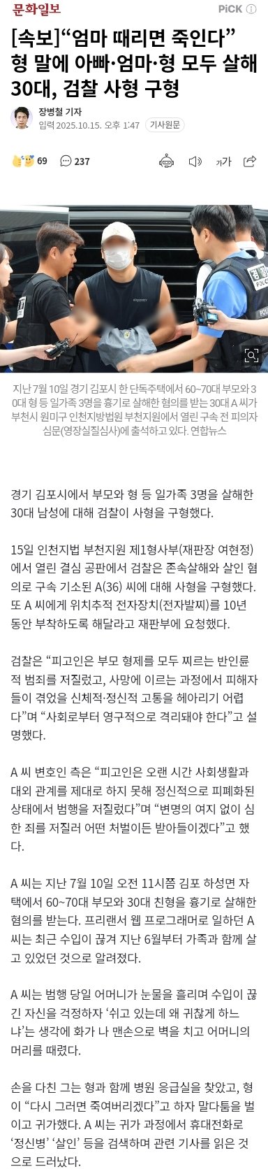 [속보]“엄마 때리면 죽인다” 형 말에 아빠·엄마·형 모두 살해 30대, 검찰 사형 구형