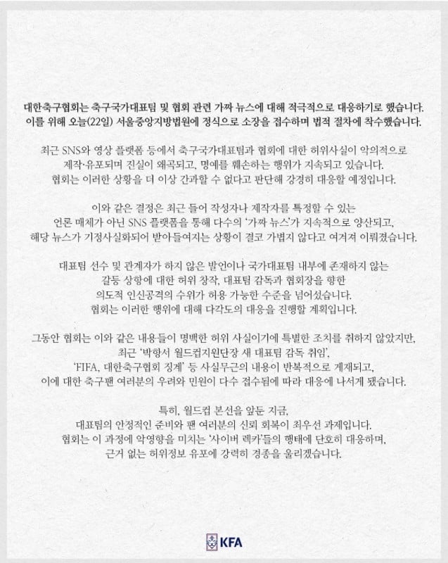 대한축구협회가 축구 국가대표팀 및 협회 관련 가짜 뉴스에 대해 적극적인 대응에 나선다.협회는 22일 서울중앙지법에 정식으로 소장을 접수하고 법적 절차에 착수했다고 밝혔다.https://www.hankyung.com/article/2025102258037