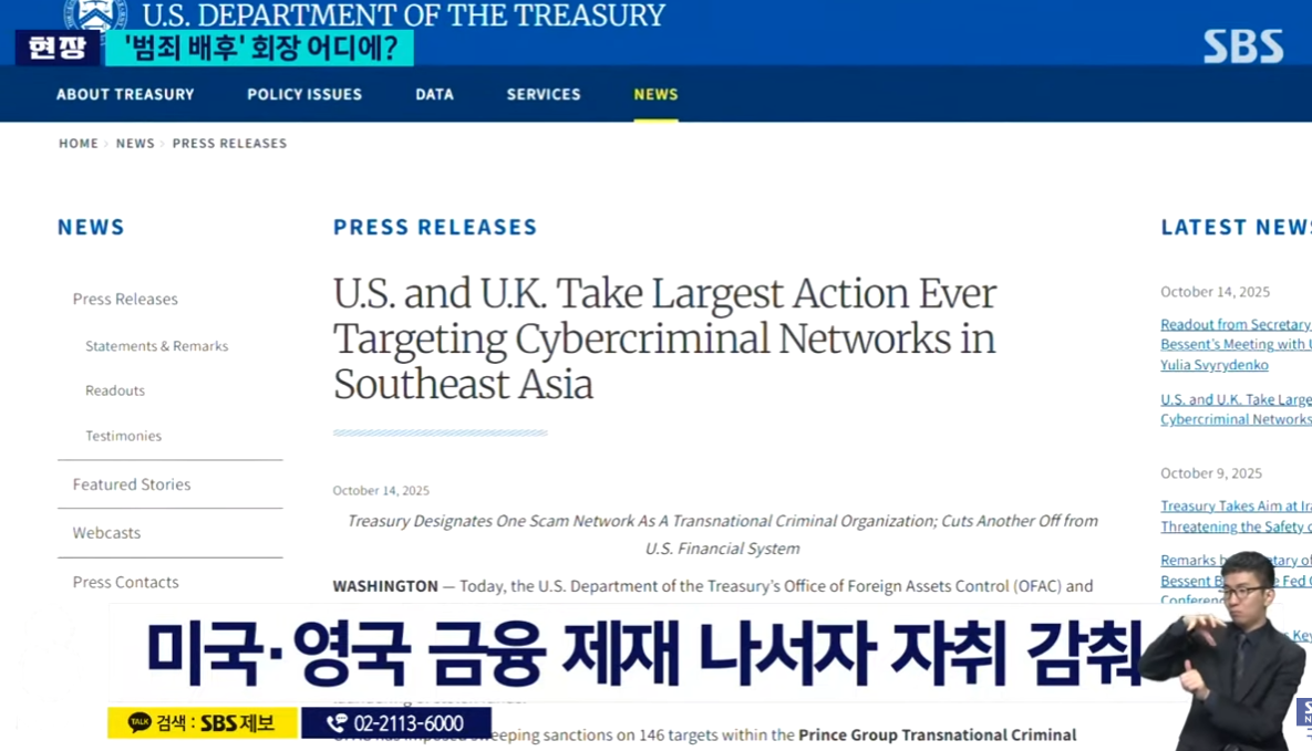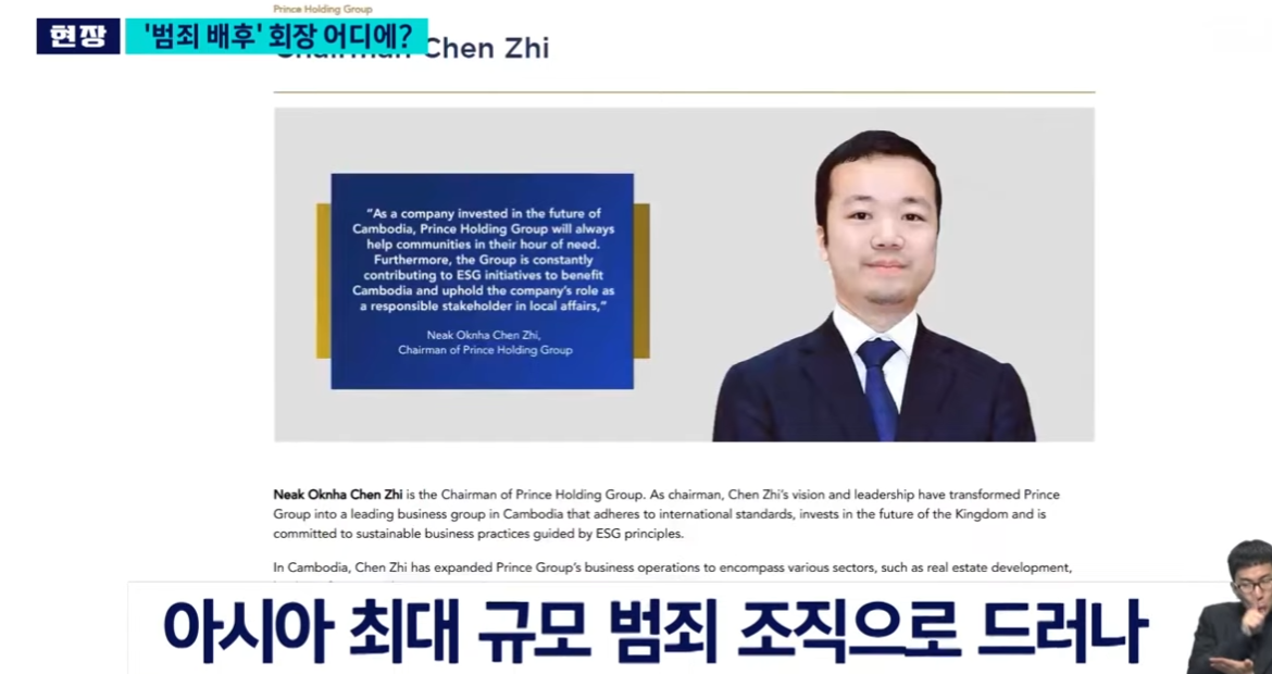 남성의 어깨와 팔, 가슴에 시뻘건 피멍이 들어 있습니다. 또 다른 남성은 머리에서 피가 흐르고, 의자에 묶인 채 쓰러진 사람도 있습니다. 미국 법무부가 프린스그룹 천즈 회장을 금융사기와 자금 세탁 등 혐의로 기소하며 공개한 범죄 증거들입니다. 1987년생인 천즈가 지난 2015년부터 이끈 프린스그룹은 부동산과 금융, 호텔, 통신 등 사업을 해왔는데, 공소장에 드러난 실체는 아시아 최대 규모의 범죄 조직이었습니다. 범죄단지를 만들어 외국인들을 납치, 감금한 뒤 온라인 사기에 강제 동원해 전 세계 피해자들의 돈을 뜯어낸 걸로 드러났습니다. 최근 미국과 영국 정부가 수십조 원대 범죄 수익과 재산을 압수 동결하면서 법적 제재에 나서자 돌연 자취를 감췄습니다. 여기는 캄보디아 프놈펜의 프린스 홀딩 그룹 건물입니다. 하지만, 건물 외벽 어디에도 프린스라는 이름은 찾아볼 수 없습니다. 건물로 다가서자 경비원들이 막아서고, [우리는 그냥 길을 걷고 있어요. 여기를 둘러보고 있어요. (촬영하지 마세요.)] 프린스 그룹의 부동산 계열사인 킹스맨 그룹이라고만 말합니다. [건물 경비원 : 여기는 킹스맨 부동산 그룹입니다. (프린스 그룹과 같은 회사인가요?) 킹스맨이에요. 프린스가 아니에요.] 회장 천즈의 행방에 대해선 모르쇠로 일관합니다. [건물 안내소 직원 : (천즈 회장은 어디에 있나요?) 죄송합니다. 저도 연락처를 모릅니다. 당신이 직접 연락할 수는 없어요.] 프린스그룹이 흔적 지우기에 나서면서 계열 은행에선 예금을 대거 인출하는 '뱅크런' 조짐마저 나타났습니다. [프린스 은행 직원 : 고객들이 걱정하면서 예금을 인출하러 은행을 찾아왔습니다. (하지만) 은행은 충분한 현금을 갖고 있습니다.] 프린스그룹이 외국인들을 감금한 곳으로 알려진 태자단지. 현지 경찰 단속에 급하게 도주했는지, 건물 안엔 한국인들의 신분증과 통장 등이 버려져 있었습니다. 우리 금융기관도 프린스그룹에 대한 제재에 나섰지만, 천즈 회장이 사라지면서 피해 회복과 처벌까지는 난항을 겪을 것으로 보입니다.