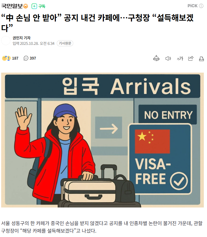 “中 손님 안 받아” 공지 내건 카페에…구청장 “설득해보겠다”
