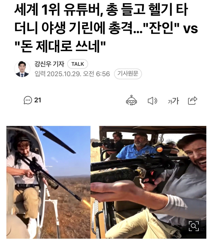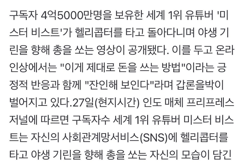 세계 1위 유튜버 수백마리 야생기린한테 총 쏴서 논란