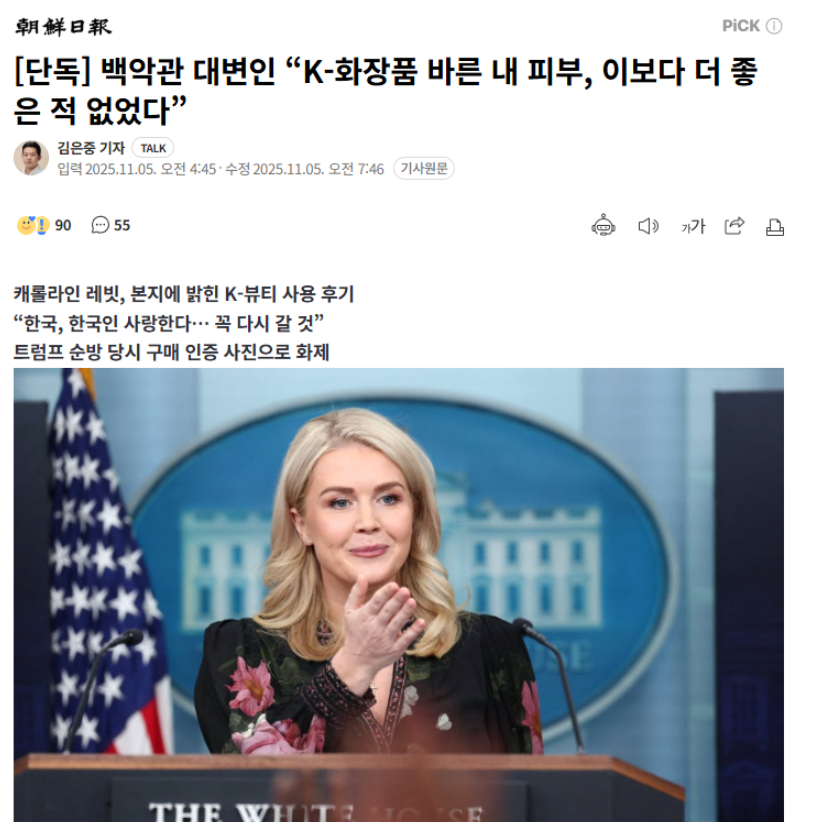 [단독] 백악관 대변인 “K-화장품 바른 내 피부, 이보다 더 좋은 적 없었다”