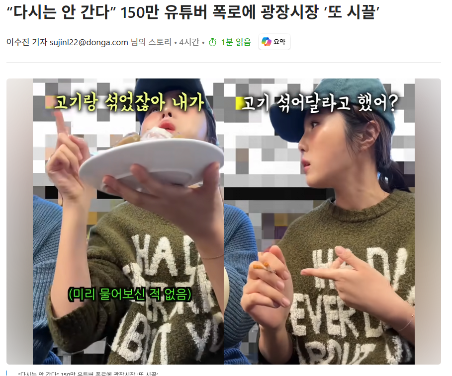 “다시는 안 간다” 150만 유튜버 폭로에 광장시장 ‘또 시끌’