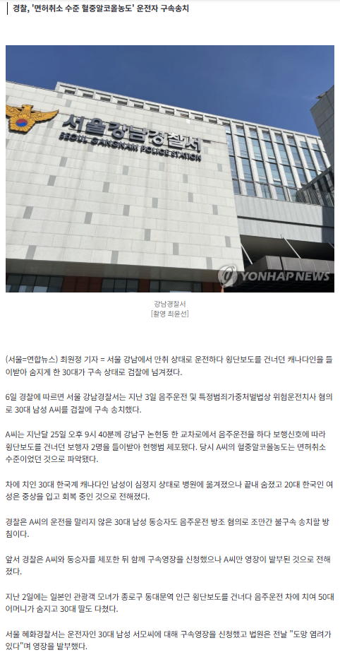 강남서 길 건너던 캐나다인 차에 치여 숨져