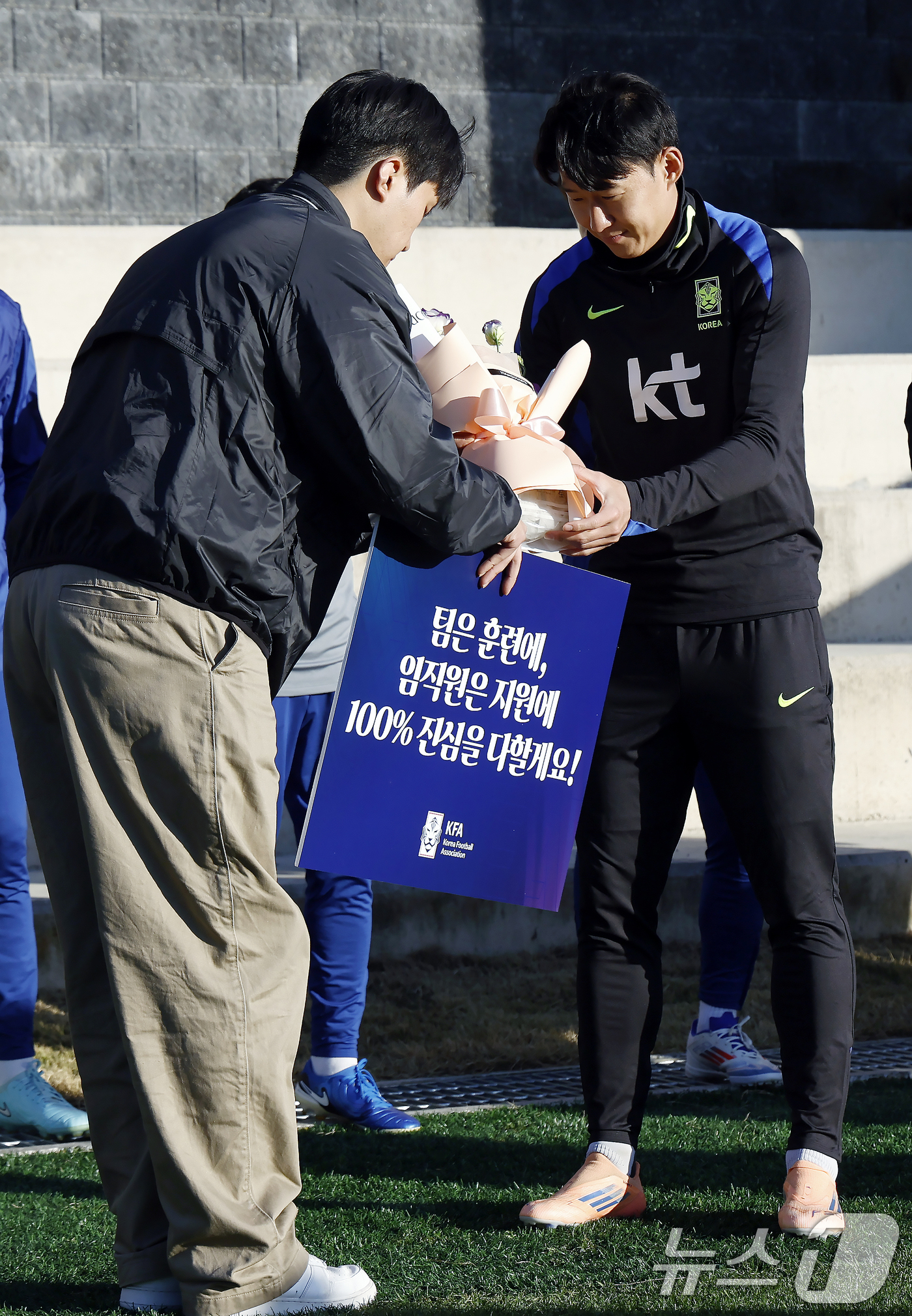 대한민국 축구 국가대표팀 손흥민이 10일 충남 천안시 서북구 대한민국축구종합센터 하이브리드잔디 훈련장에서 대한축구협회 직원에게 입소 환영 꽃다발을 받고 있다.https://www.news1.kr/photos/7592589