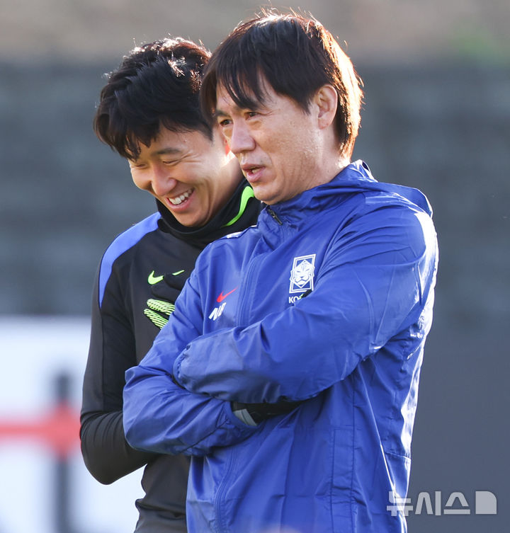 홍명보 대한민국 축구 국가대표팀 감독과 주장 손흥민이 10일 오후 충남 천안시 대한민국축구종합센터에서 훈련에 앞서 대화https://www.newsis.com/view/NISI20251110_0021051975