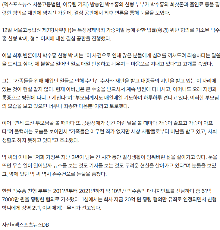 '20억 횡령' 박수홍 친형 부부, 법정서 오열