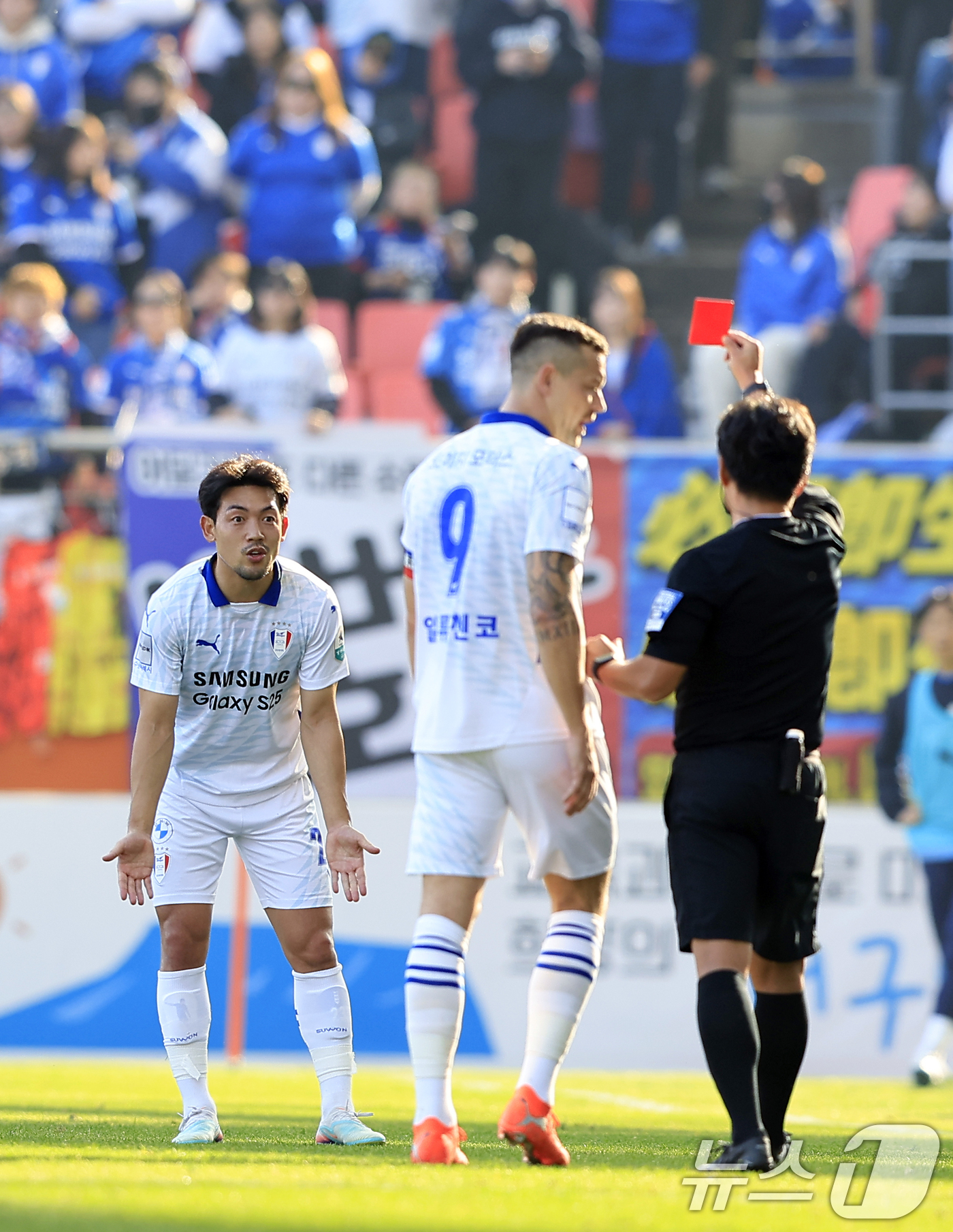 7일 오후 제주 서귀포시 월드컵로 제주월드컵경기장에서 열린 하나은행 K리그 승강 플레이오프 2025 2차전 제주SK와 수원삼성의 경기에서 수원 이기제가 레드카드를 받고 있다.https://www.news1.kr/photos/7639043