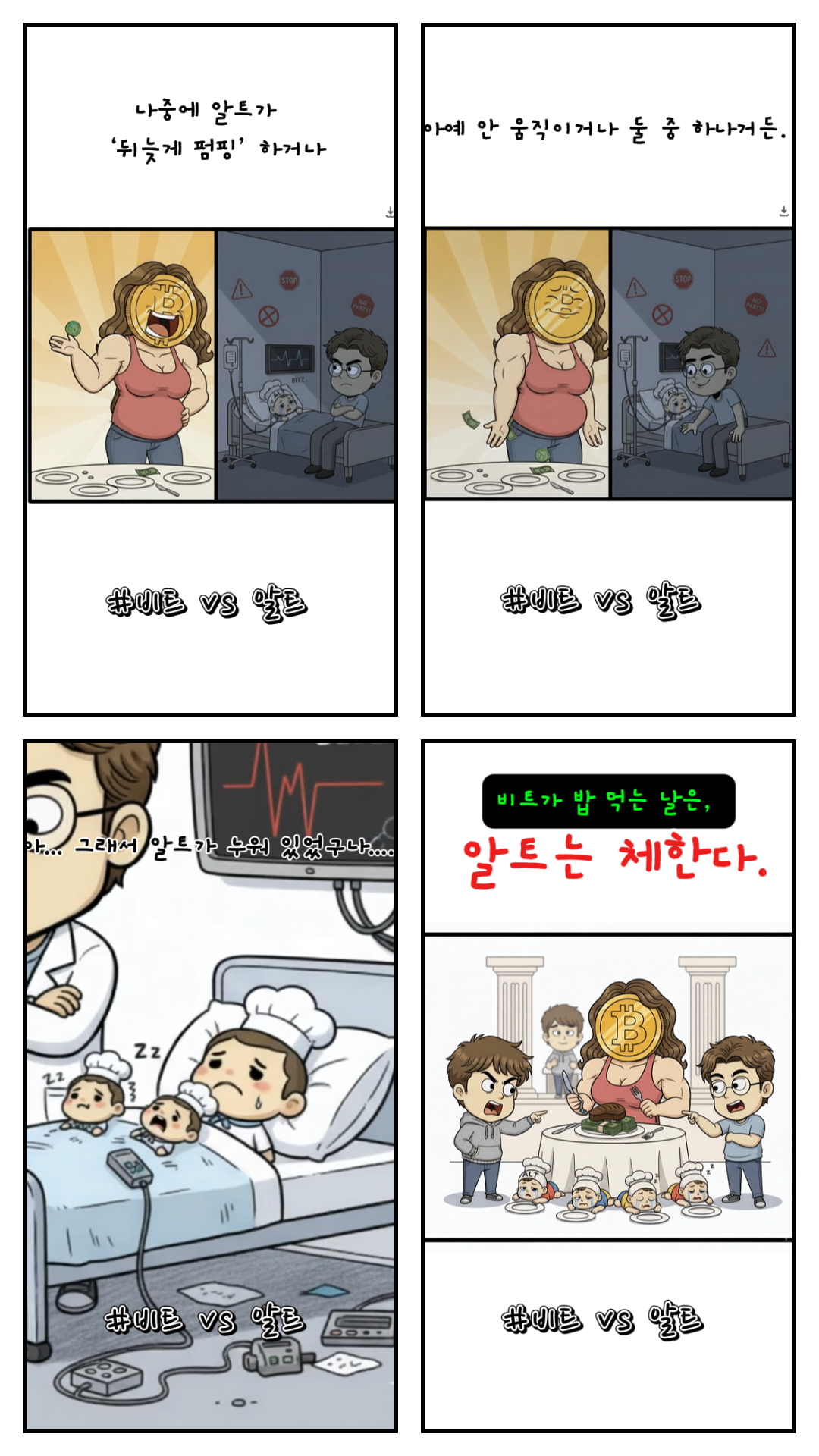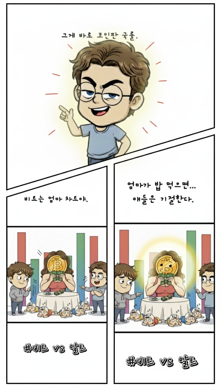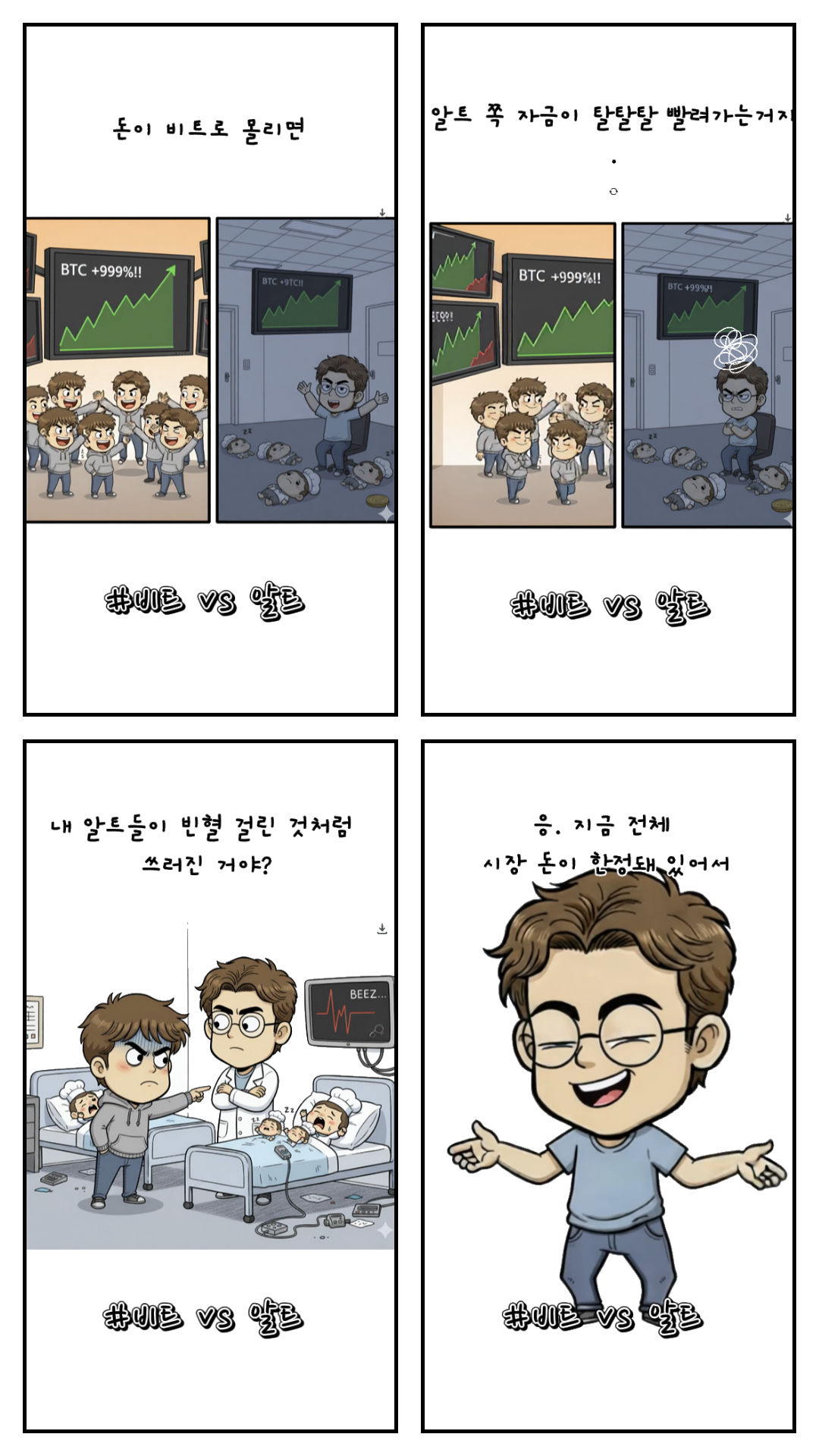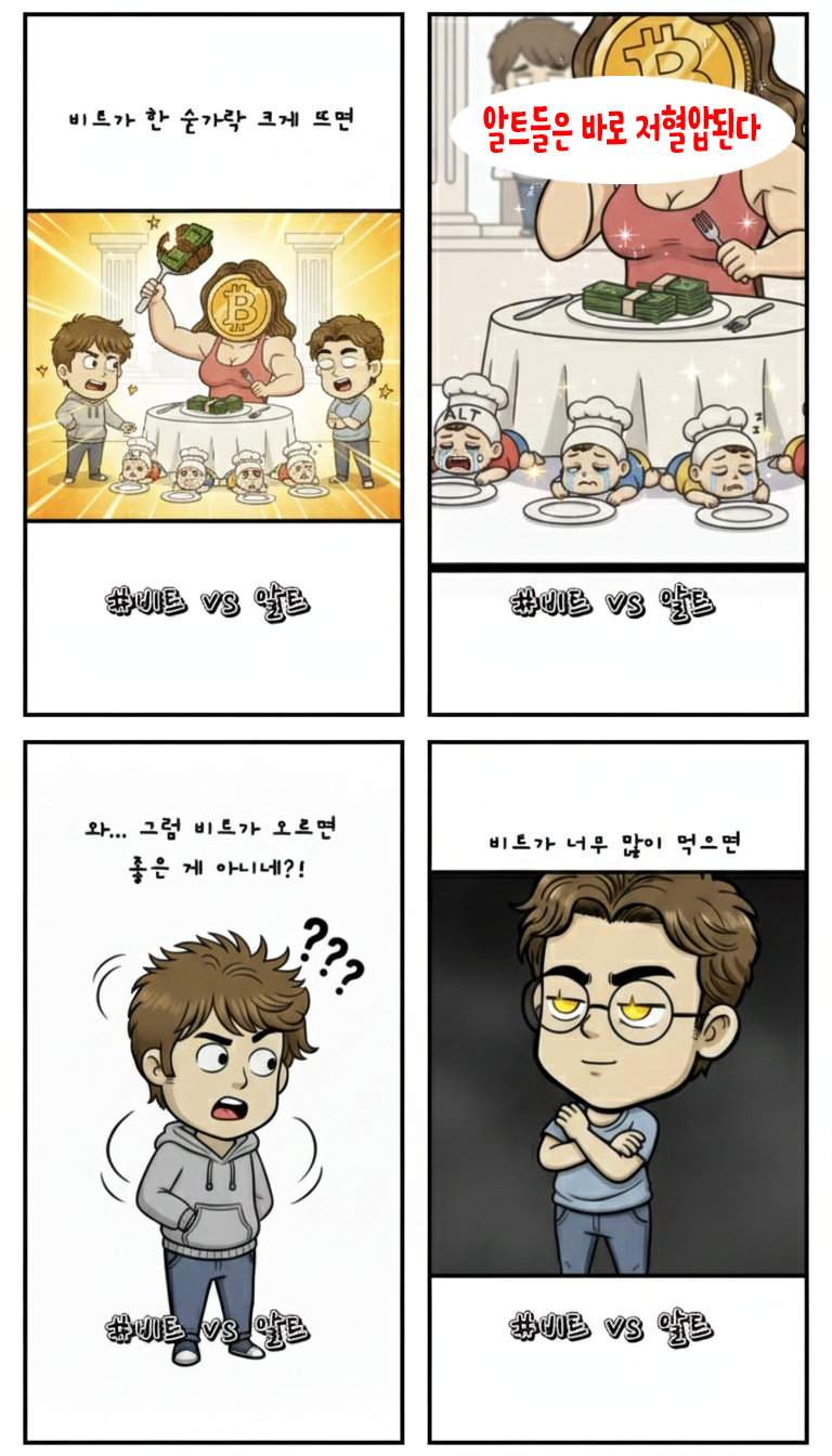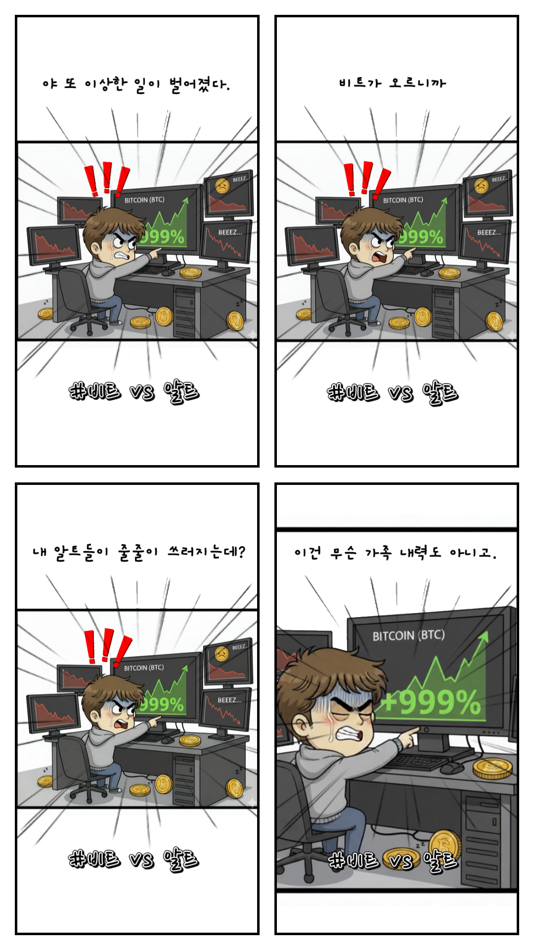 🌕 비트코인이 오르면 알트가 기절하는 이유 (친절한 기초 설명)1️⃣ 시장의 돈은 ‘한정적’이다코인 시장 전체를 하나의 큰 통돼지 저금통이라고 생각하면 돼.여기 안에 들어있는 돈의 양은 제한적이야.어떤 날은 돈이 많고어떤 날은 돈이 적고하지만 갑자기 엄청난 새 돈이 들어오는 경우는 거의 없음.2️⃣ 투자자들은 가장 안전하다고 느끼는 곳으로 돈을 몰아준다코인 시장에서 ‘엄마 같은 존재’는 바로 비트코인(BTC).제일 오래됨제일 큰 코인제일 안정적큰 손(기관·고래)들도 BTC부터 사기 시작함그래서 시장이 움직일 때 가장 먼저 돈이 몰리는 곳 → 비트코인3️⃣ 비트가 오르면 투자자들이 알트에서 돈을 빼서 비트로 이동한다비트코인이 막 상승할 조짐을 보이면 사람들은 이렇게 생각함:“지금은 비트 흐름이 더 좋다! 알트는 나중에 해도 되지.”그래서 알트코인에 넣어둔 돈을 빼서 비트코인으로 옮긴다.결과적으로…🔺 비트코인 → 돈이 몰리니 가격 폭등🔻 알트코인 → 돈이 빠져나가니 가격 하락 또는 잠잠이걸 ‘알트가 기절한다’고 표현한 거야.4️⃣ 비트 상승장은 보통 ‘알트 휴식기’와 함께 온다비트코인 주도장에서는:비트만 오르고알트는 거의 움직이지 않거나 떨어짐차트가 “죽은 듯이 가만히 있음”이유는 단 하나,돈이 전부 비트로 몰려버려서 알트는 에너지가 없기 때문.5️⃣ 그럼 알트는 언제 살아나?비트가 어느 정도 오르고 나면 사람들이 이렇게 말함:“비트는 너무 비싸졌네…이제 싼 알트에서 기회 찾을까?”그러면 비트 → 알트로 자금이 다시 이동이때 알트들이 한꺼번에 ‘뒤늦게 펌핑’ 하는 것처럼 보임.이걸 알트 시즌(Alt Season) 이라고 부름.