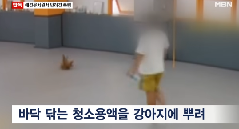 CCTV 영상에는 청소용액을 강아지에게 뿌리고 발로 걷어차는 장면이 고스란히 담겼습니다.