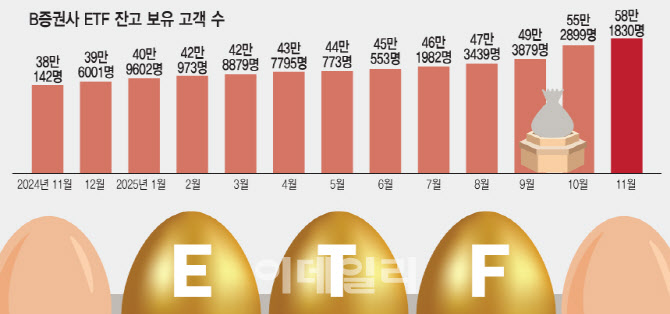 반면 ETF 투자자 수 증가세는 50대와 60대 이상에서 가장 높게 나타났다. B증권사에서 ETF를 보유한 고객 수는 58만 1830명으로 지난해 11월 말 대비 53.0% 증가했다. 연령대별로는 60대 이상이 63.4%, 50대가 55.6% 순으로 크게 늘었다. A증권사에서도 50대 10.31%, 60대 이상 8.77% 순으로 높은 증가율을 보였다.