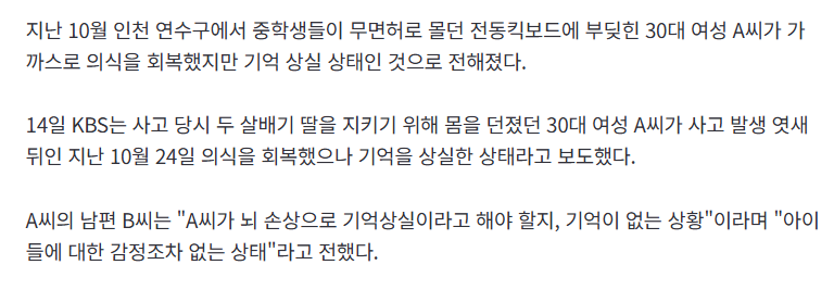 중학생킥보드 딸에게 돌진하자 몸 던진 엄마..."기억상실"