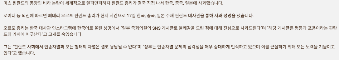 중국, 한국, 일본을 모두 적으로 만들다니. 그것도 정치인들이..이제 핀란드는 인종 차별하는 국가 이미지