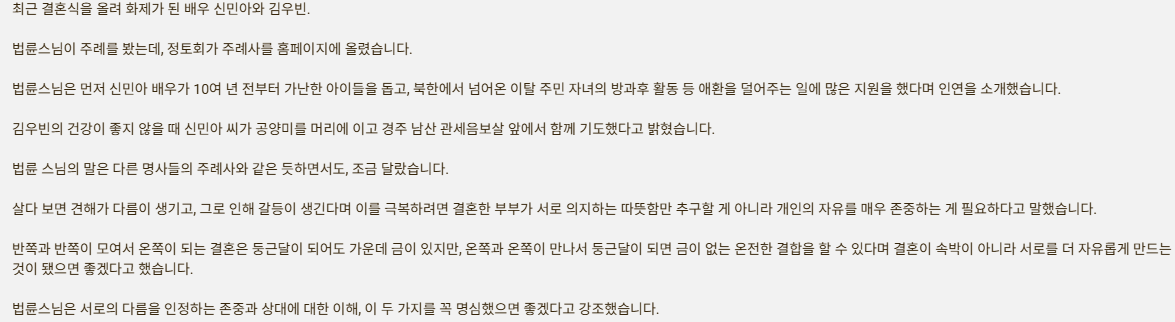김우빈 투병 때 신민아가 한 일…법륜스님 주례사로 공개