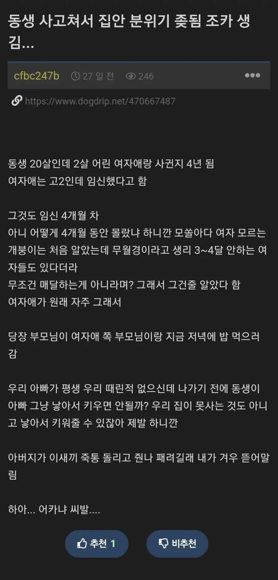 동생이 사고쳐 고딩 여친 임신