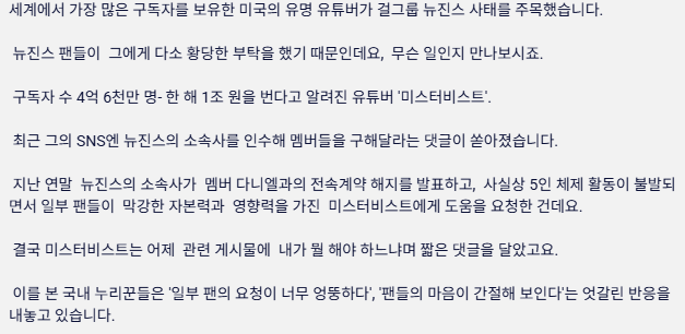 뉴진스 구해달라요청에 세계 1위 유튜버반응