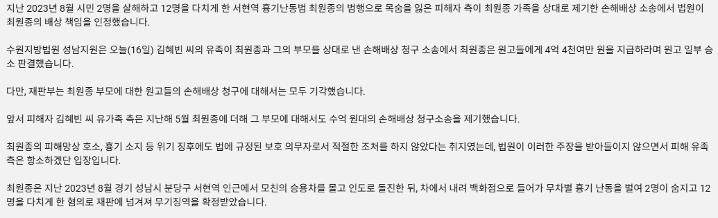 "’분당 흉기난동’ 최원종, 유족에 4억 4천만원 배상하라"