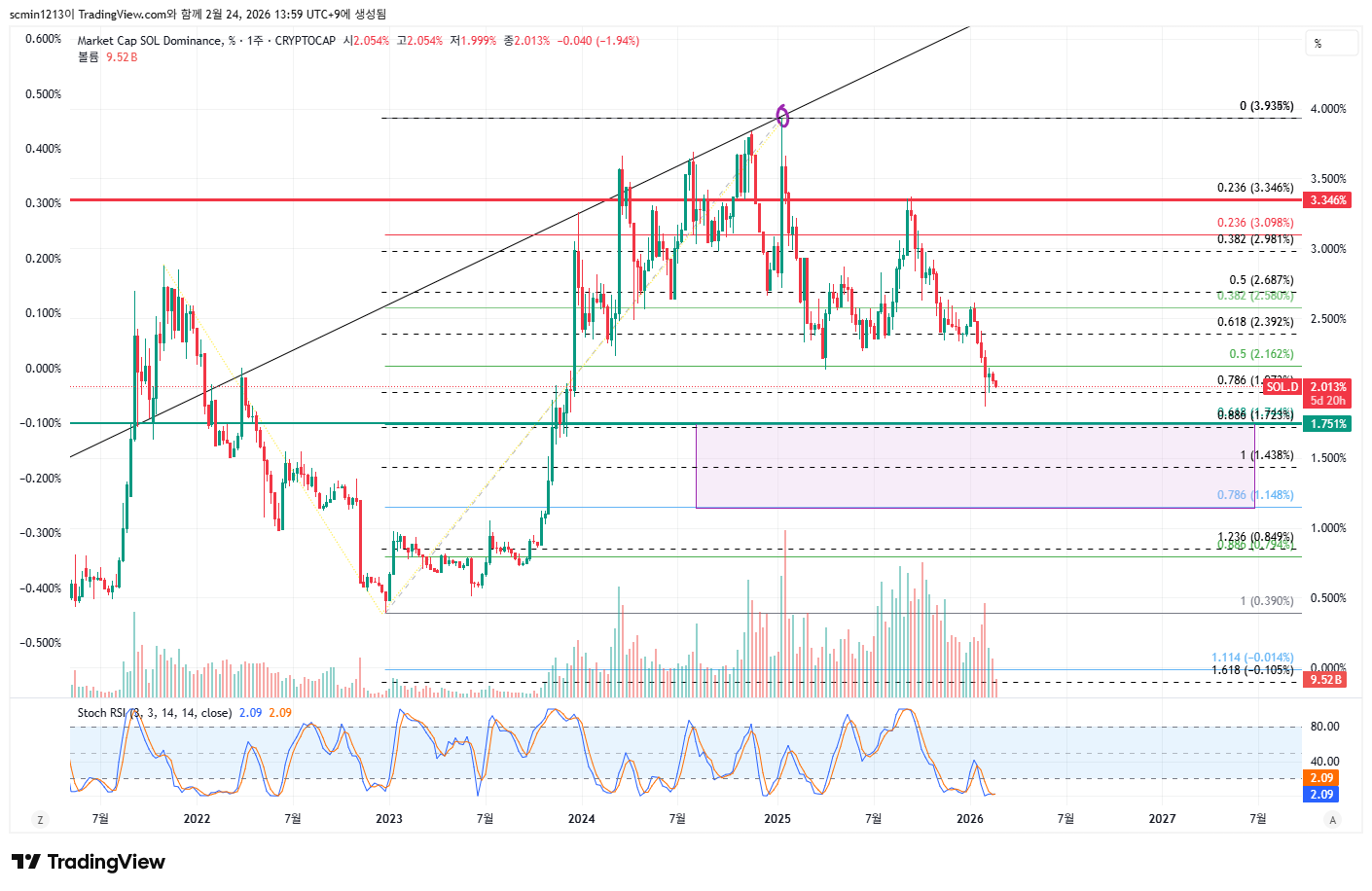 솔라나 가격찻 보박에서 한번 상승 나온거라 이제 사실 저 보박 지워야하긴해요 재작년 말에 그린거고 작년 4월에 상승 나온거네요 차트가 솔라나는 도미만 보는중 이제 가격 안보고 있음