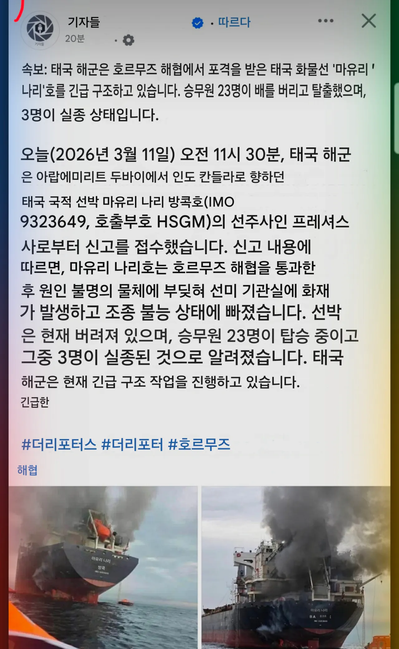 [속보]태국 화물선 호르무즈 해협에서 포격 당...
