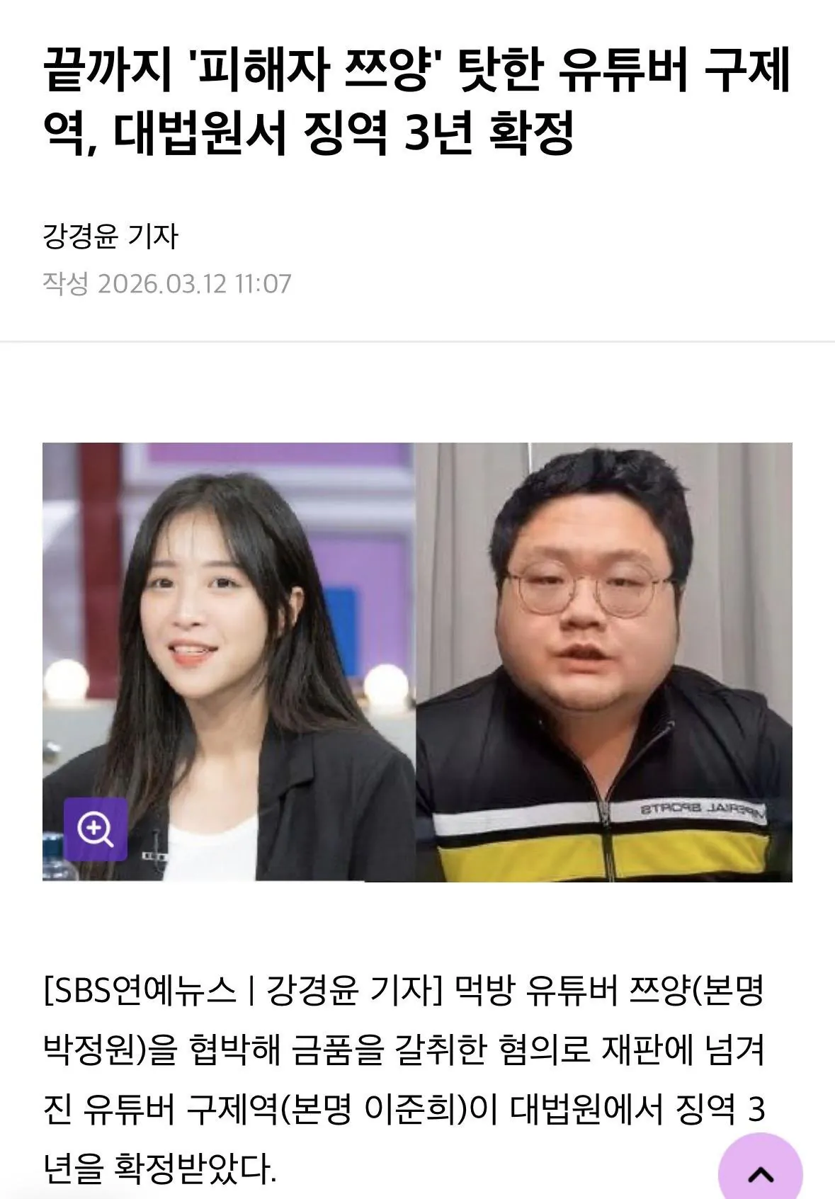 쯔양 협박한 구제역 ‘징역3년’ 확정