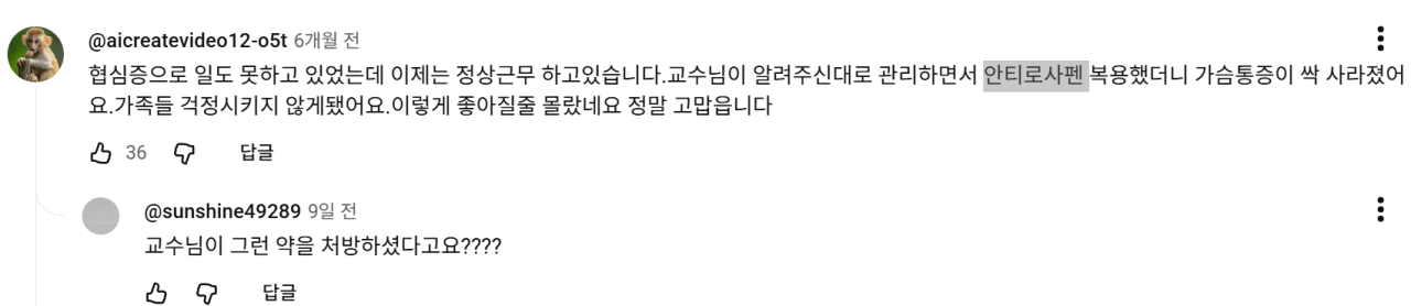 심장 질환 관련 영상들 아래에 자꾸만 '안티로사펜'이라는 약품에 대한 체험담이 올라와 있더군요. 약을 먹고 심장병이 나았다는 내용들이었습니다.