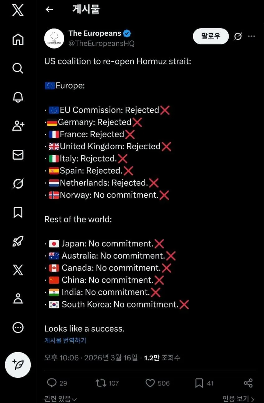 호르무즈 지킬 때 동맹들 왜 안 도와