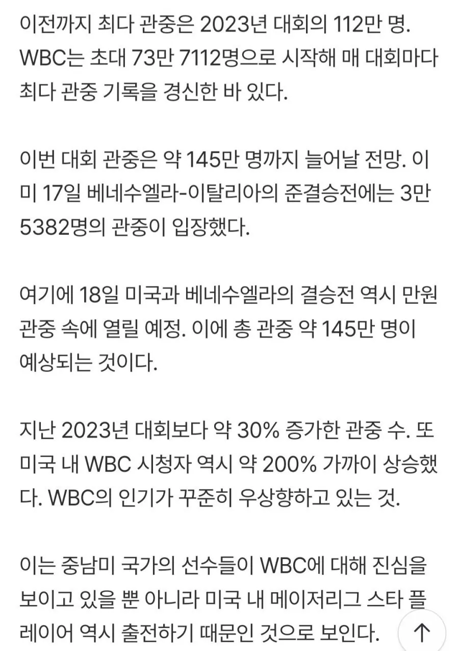 메이저리그도 이 대회를 새롭게 평가하고 있음. 애런 저지가 WBC 우승이 월드시리즈보다 더 대단하다고 한 발언이 화제이고, 리그 사무국도 앞으로 더 크게 밀 계획이라고
