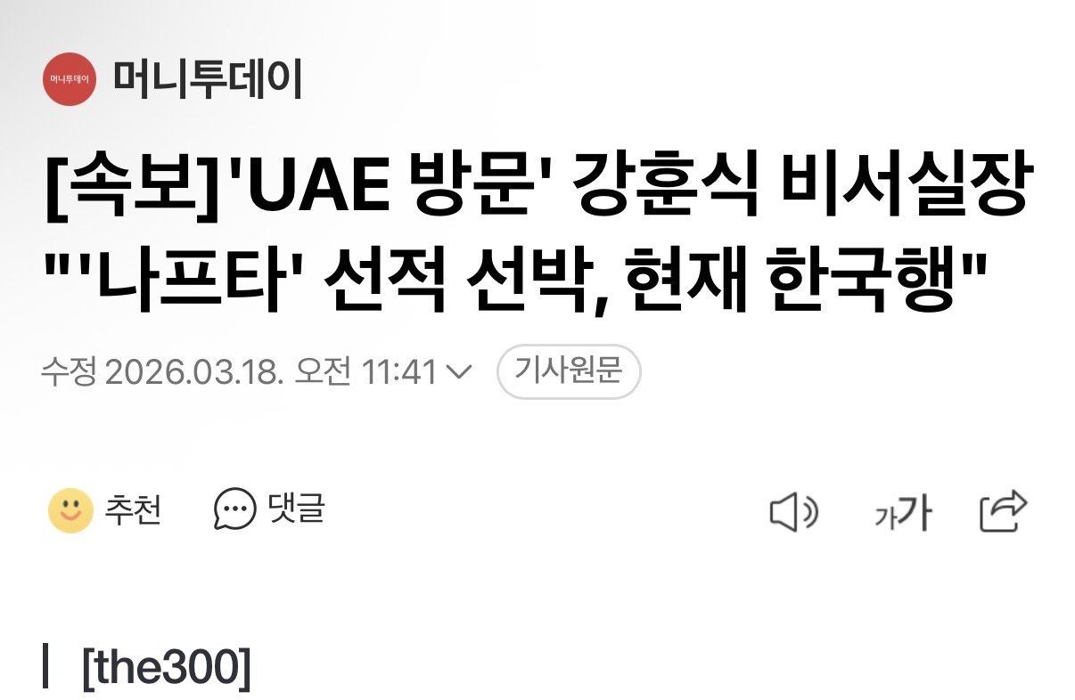 천궁 같은 무기를 공급한 것에 대한 답례로 UAE가 한국에 원유를 우선 공급하기로 했다고 한다.에너지 수급이 꽤 급한 상황인 모양이다.지금 석유 수송선들이 한국으로 빠르게 이동 중이라는 소식이 있다.
