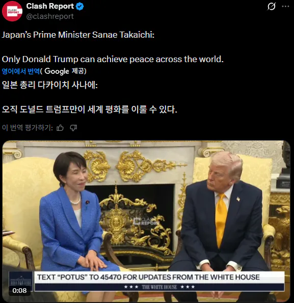 다카이치는 트럼프만이 평화를 가능하게 할 거라고 입으로만 칭찬