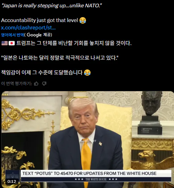 나토를 깎아내리면서도 일본은 챙겨주는 트럼프의 모습다카이치 곁에 있는데도 갑자기 파월 의장한테 10분을 훨씬 넘게 욕을 퍼붓더라고이란 군사력 완전히 박살, 네타냐후가 말렸다 같은 이전 발언만 자꾸 반복이어서 기자들 질문 시간엔 진주만 네타를 한 바퀴 던지고서꼭 와야 할 필요는 없지만 와줘서 고맙다고 정리결국 특별히 주목할 만한 내용 없음ㅋㅋㅋㅋㅋ
