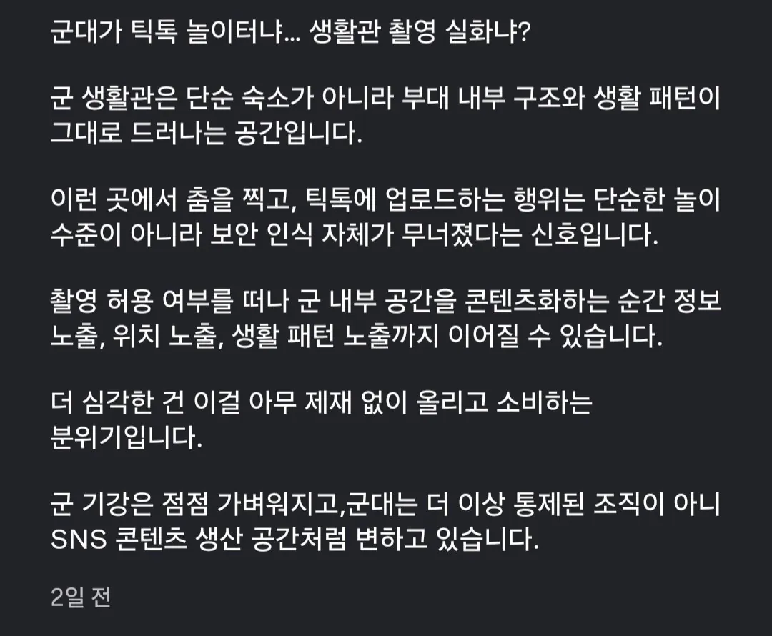 생활관 안에서 춤을 춘 거를 틱톡에 올린 거 같음
