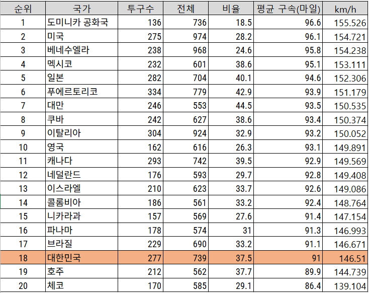 반면, 대한민국 야구 대표팀의 이번 대회 패스트볼 평균 구속은 91마일(146.5km/h)로 20개 국가 중 18위에 그쳤다. 인종과 체격 차이는 일본과 대만이 있기 때문에 핑곗거리가 되지 못한다. 한국 대표팀보다 패스트볼 평균 구속이 느린 팀은 호주(89.9마일)와 체코(86.4마일)밖에 없었다. 두 팀 모두 조별 리그에서 한국 대표팀이 승리를 거둔 국가라는 점은 흥미롭다.