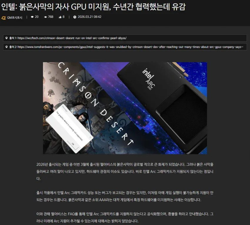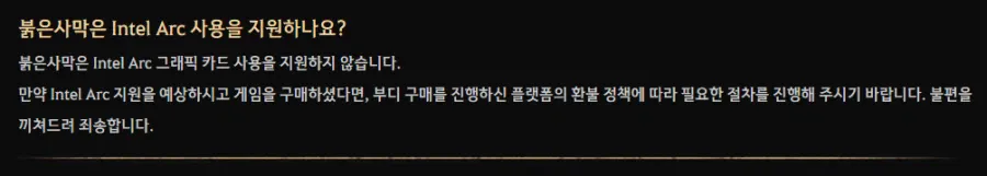 인텔 펀딩을 받으면서도 아크 그래픽카드 호환성을 완전히 무시했던 회사가 있었는데세간의 항의가 불어나니까 갑자기 입장을 바꿨다고 함환불 거부 선언을 하고 앞으로 드라이버 업데이트와 최적화에 나서겠다고 발표함물론 지금 나온 패치도 여러 버그와 오류가 계속 보인다는 게 함정