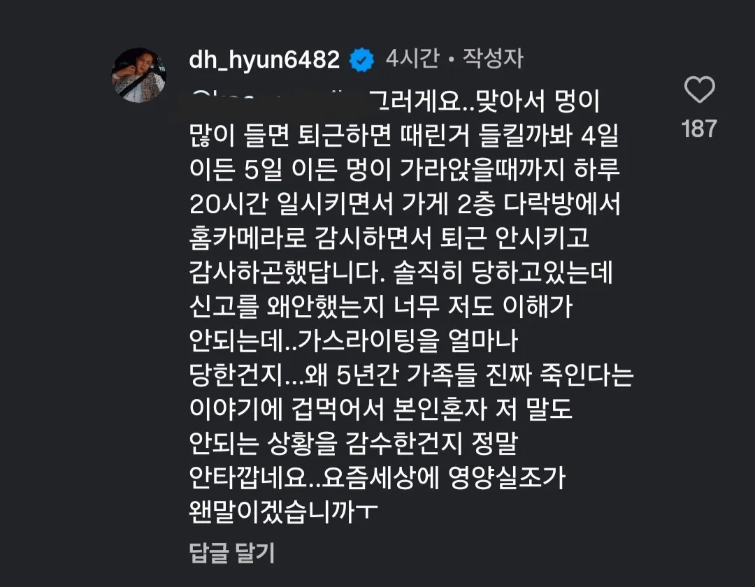 어떻게 이런 일이 일어날 수 있는지 정말 황당하다... 가족도 있을 텐데 직원을 저렇게 대했다니 정말 한심하고 화난다. 이런 비인간적인 짓을 하는 놈은 반드시 응당한 벌을 받아야 하고, 절대로 용서받아서는 안 된다.